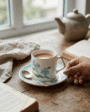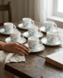 This elegant tea cup and saucer set features six pieces of fine porcelain with a charming blue floral design. Each cup is adorned with gold-plated handles and sits perfectly on a coordinating saucer with a turquoise rim. Perfect for serving tea to guests or adding a touch of sophistication to your dining collection.