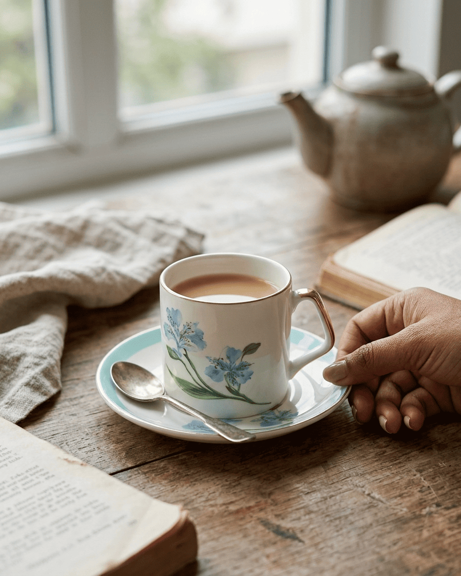 Hand wash recommended with warm water and mild soap. Avoid dishwasher to preserve gold-plating on handles. Dry immediately with a soft cloth. Store in a safe place away from direct sunlight to maintain the vibrant floral design.