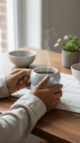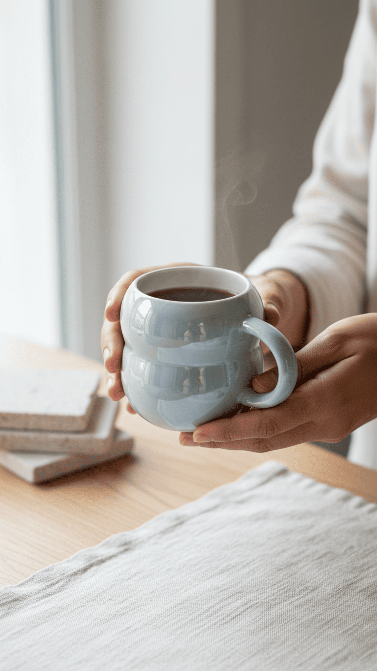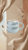 This elegant ceramic mug features a pale blue exterior with horizontal cream stripes and a pristine cream-colored interior. The comfortable curved handle and rounded body make it perfect for daily use. Its contemporary design combines functionality with aesthetic appeal, ideal for coffee, tea, or any hot beverage.