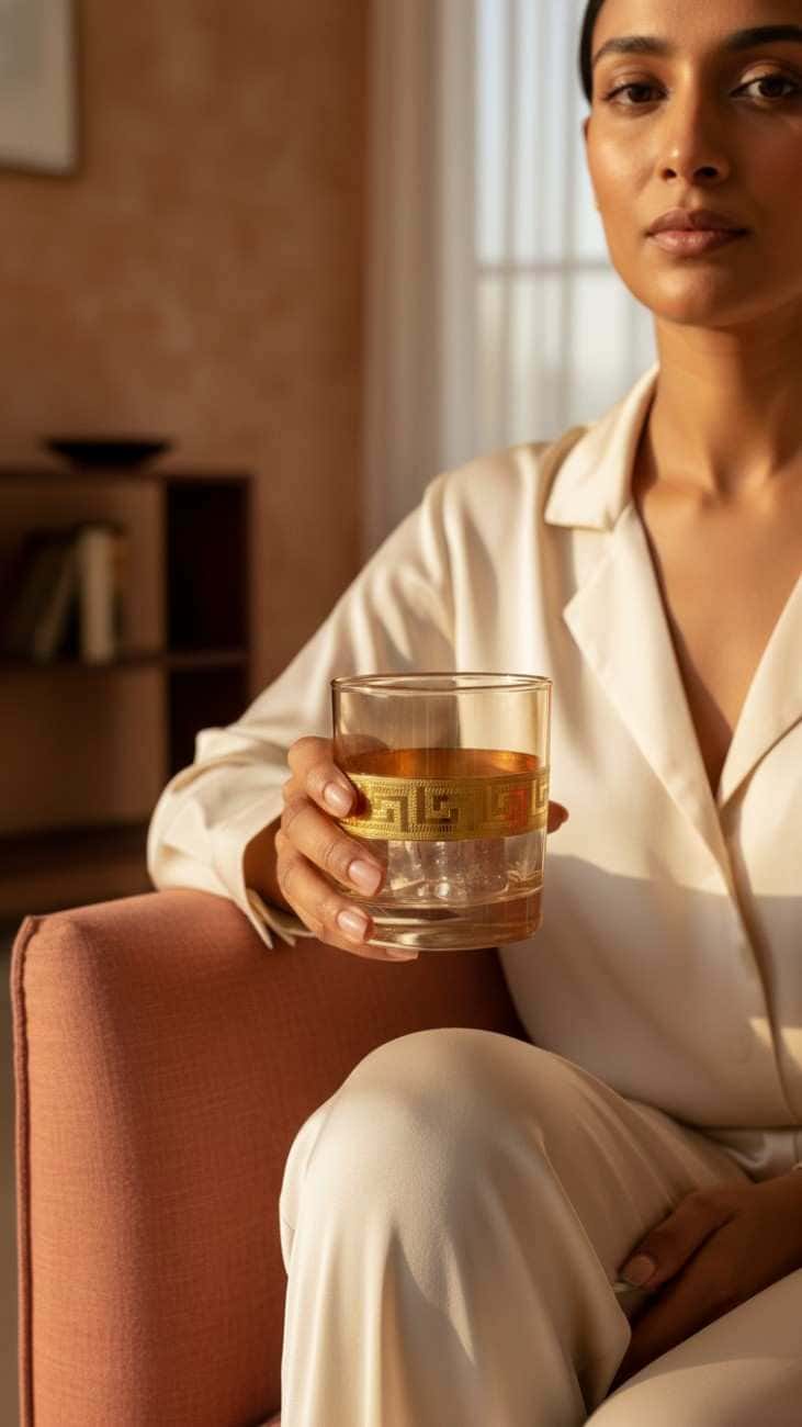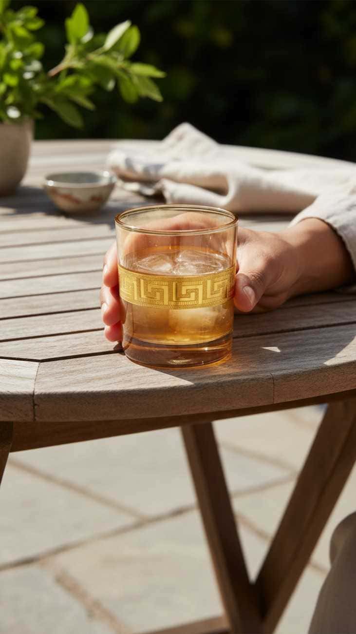 This sophisticated whiskey glass features a clear crystal design with an ornate gold-plated band displaying a traditional Greek key pattern. The gold rim and decorative metal band add a touch of luxury and elegance to any drink. Perfect for serving spirits, this glass combines timeless design with premium craftsmanship.