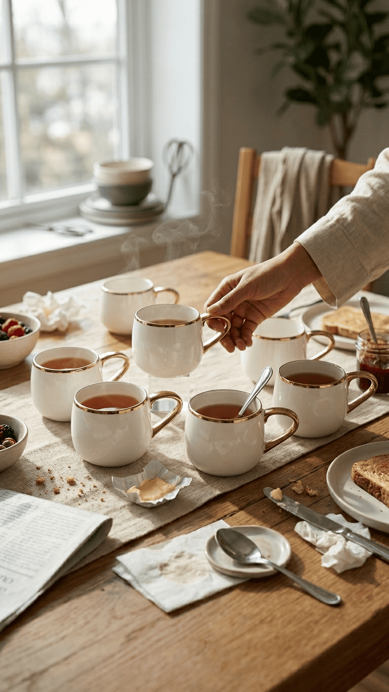 This elegant set of 6 ceramic coffee mugs features a sophisticated white finish with refined gold rim detailing and matching gold-plated handles. The contemporary design makes it perfect for both everyday use and special occasions. Ideal for serving coffee, tea, or hot beverages in style.