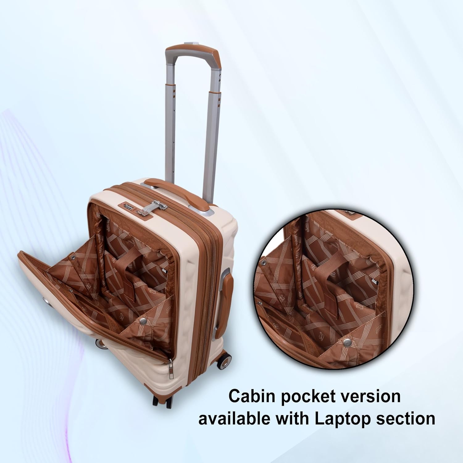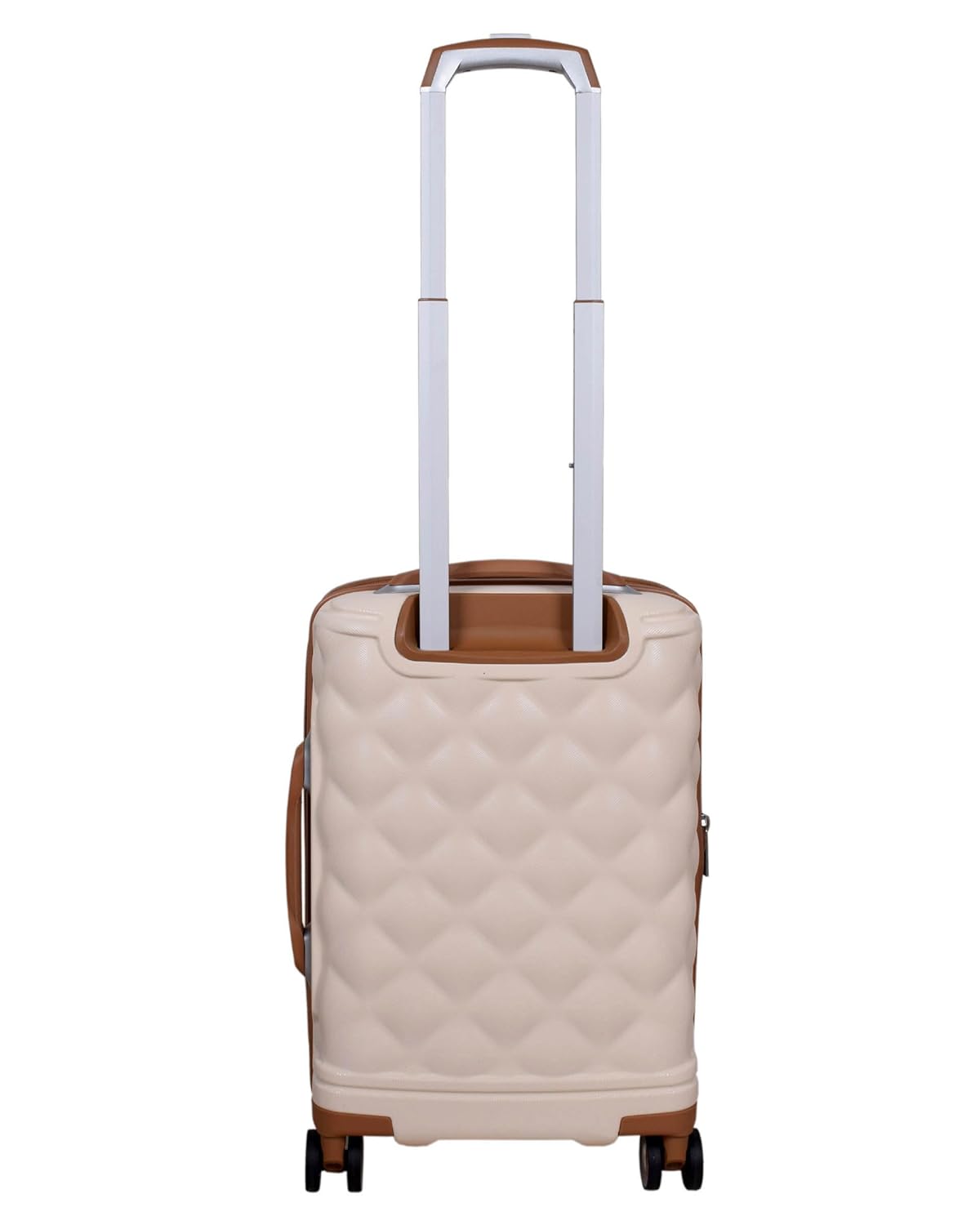 This stylish quilted hard shell trolley suitcase offers 49 liters of spacious storage capacity, perfect for short trips and weekend getaways. Weighing just 3.57kg, it features a durable ABS plastic construction with elegant brown leather accents and 360-degree spinner wheels for effortless maneuverability. The retractable handle and TSA-compatible lock ensure both convenience and security during your travels.