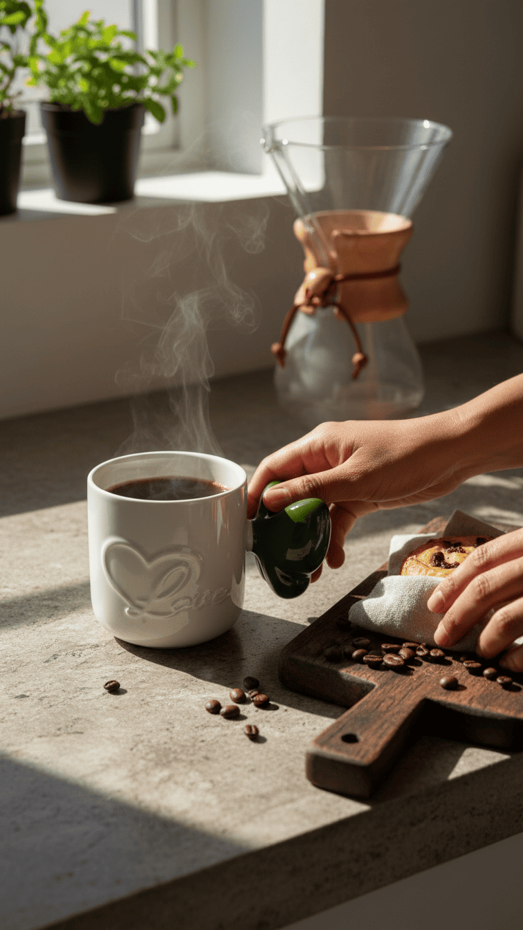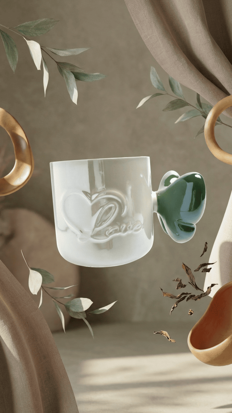 This charming ceramic mug features an embossed heart and ‘Love’ design on its white body, complemented by a distinctive green heart-shaped handle. The elegant cylindrical design makes it perfect for serving your favorite hot beverages. An ideal gift for loved ones or a delightful addition to your daily kitchen collection.