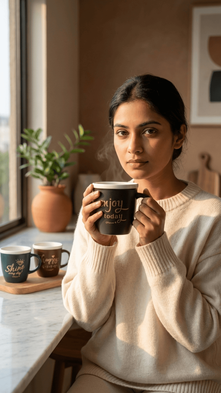 This beautiful set of 3 ceramic mugs features inspiring messages printed in elegant gold foil lettering. Each mug displays a unique positive affirmation – ‘Happy Life’, ‘Shine Every Day’, and ‘Enjoy Today’ – making it perfect for daily motivation or as a thoughtful gift. The dark exterior with cream interior creates a sophisticated look suitable for any kitchen.