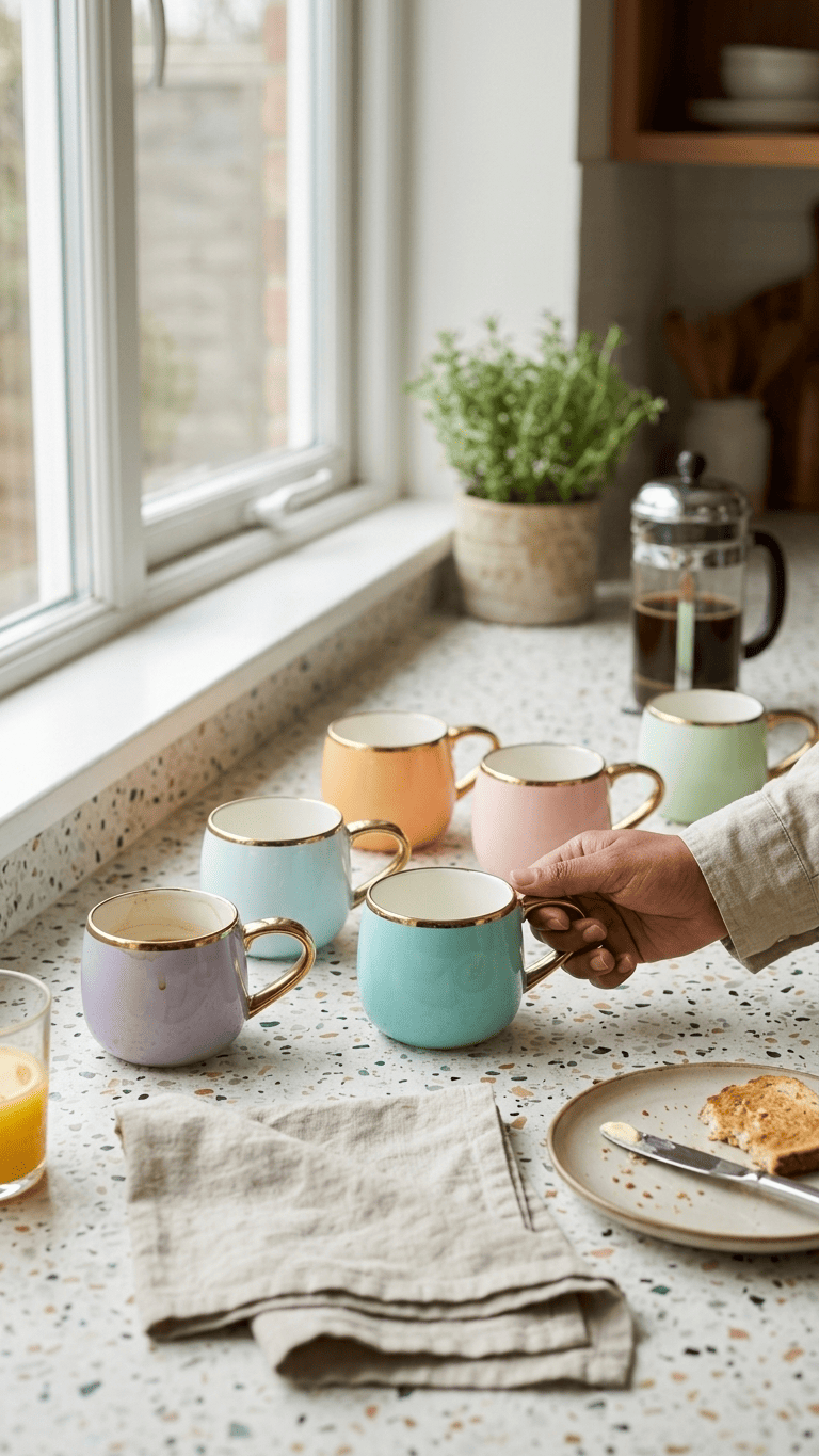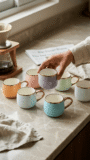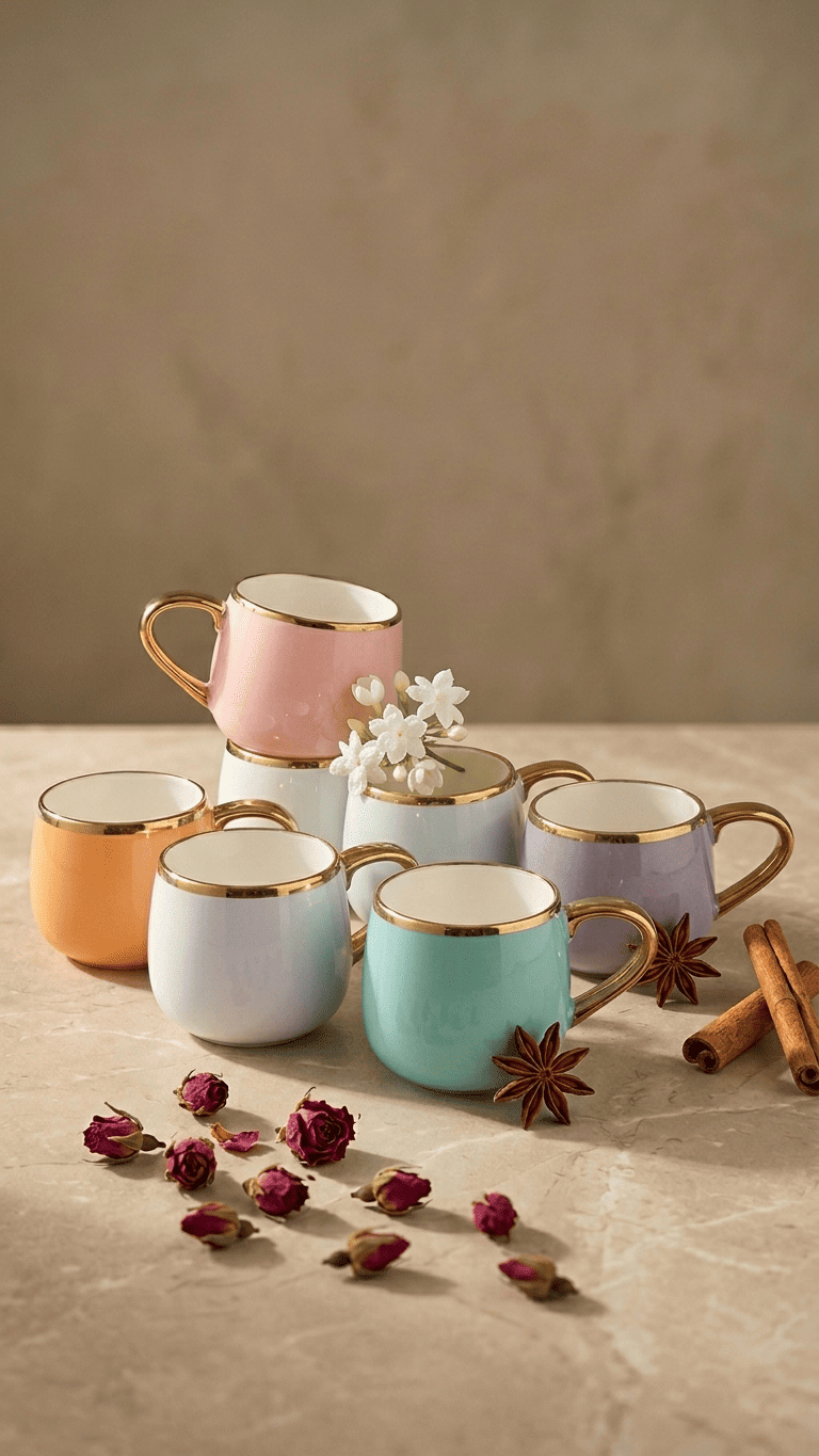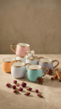 This charming set of 6 pastel ceramic mugs features beautiful soft colors including peach, light blue, pink, mint green, turquoise, and lavender. Each mug is elegantly finished with a gold-plated rim and matching curved handle, making them perfect for tea, coffee, or hot beverages. The smooth ceramic construction and premium finish make these mugs ideal for both everyday use and special occasions.