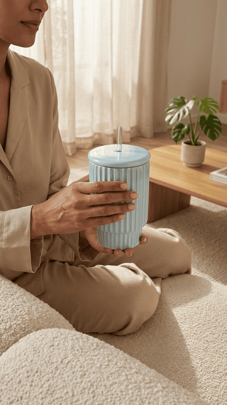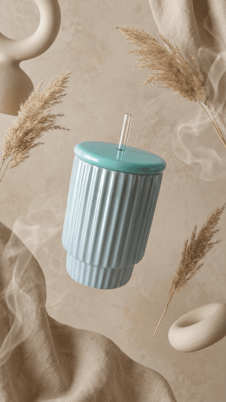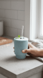 This elegant light blue tumbler features a distinctive vertical ribbed design that provides both style and functionality. It comes complete with a fitted lid and reusable straw, making it perfect for beverages on the go. The contemporary design makes it an ideal addition to any kitchen or workspace.