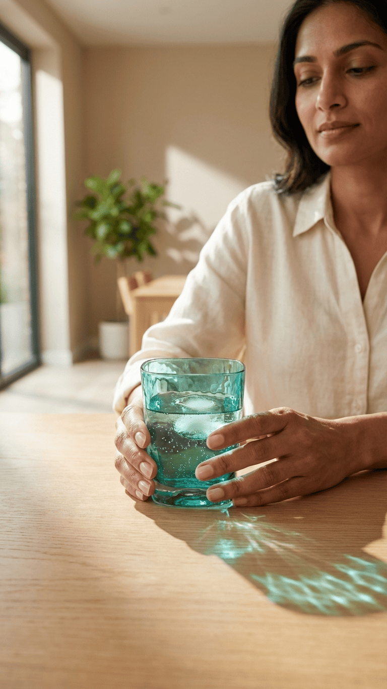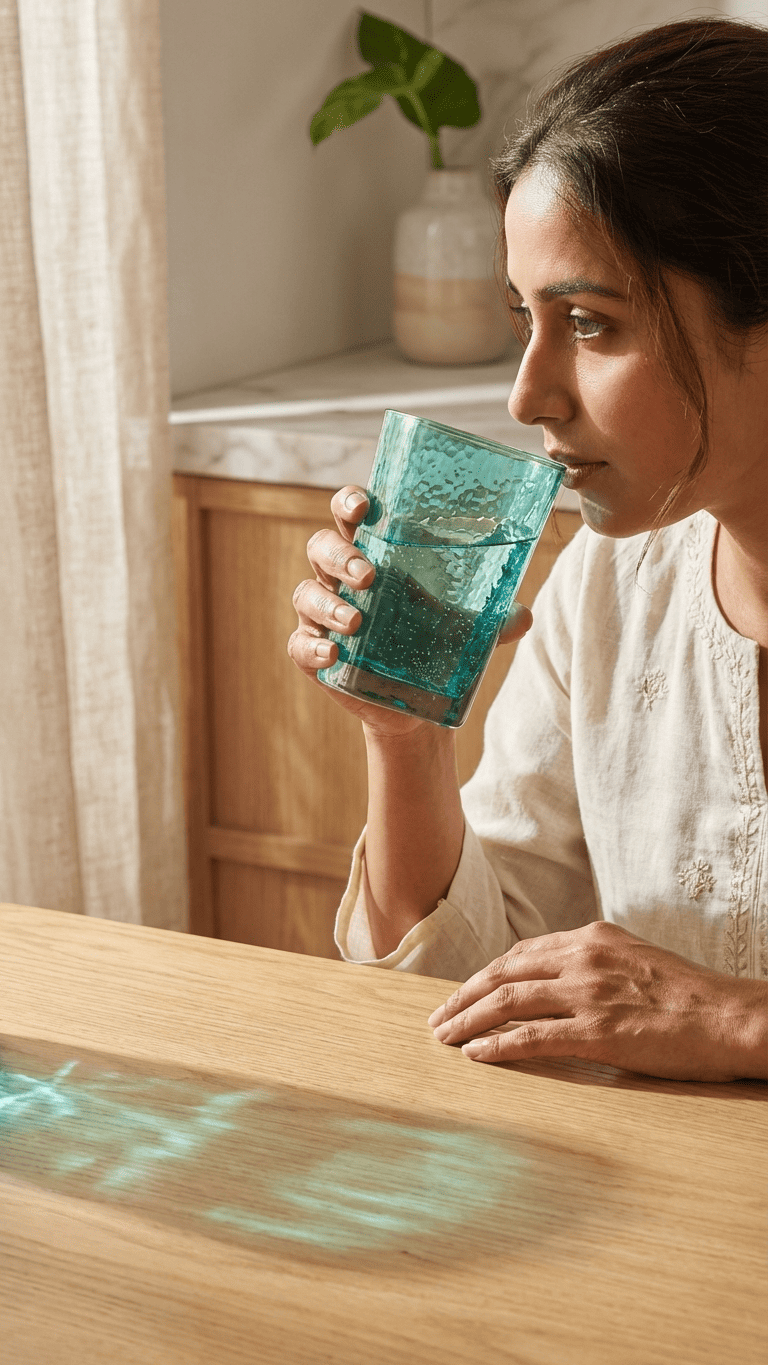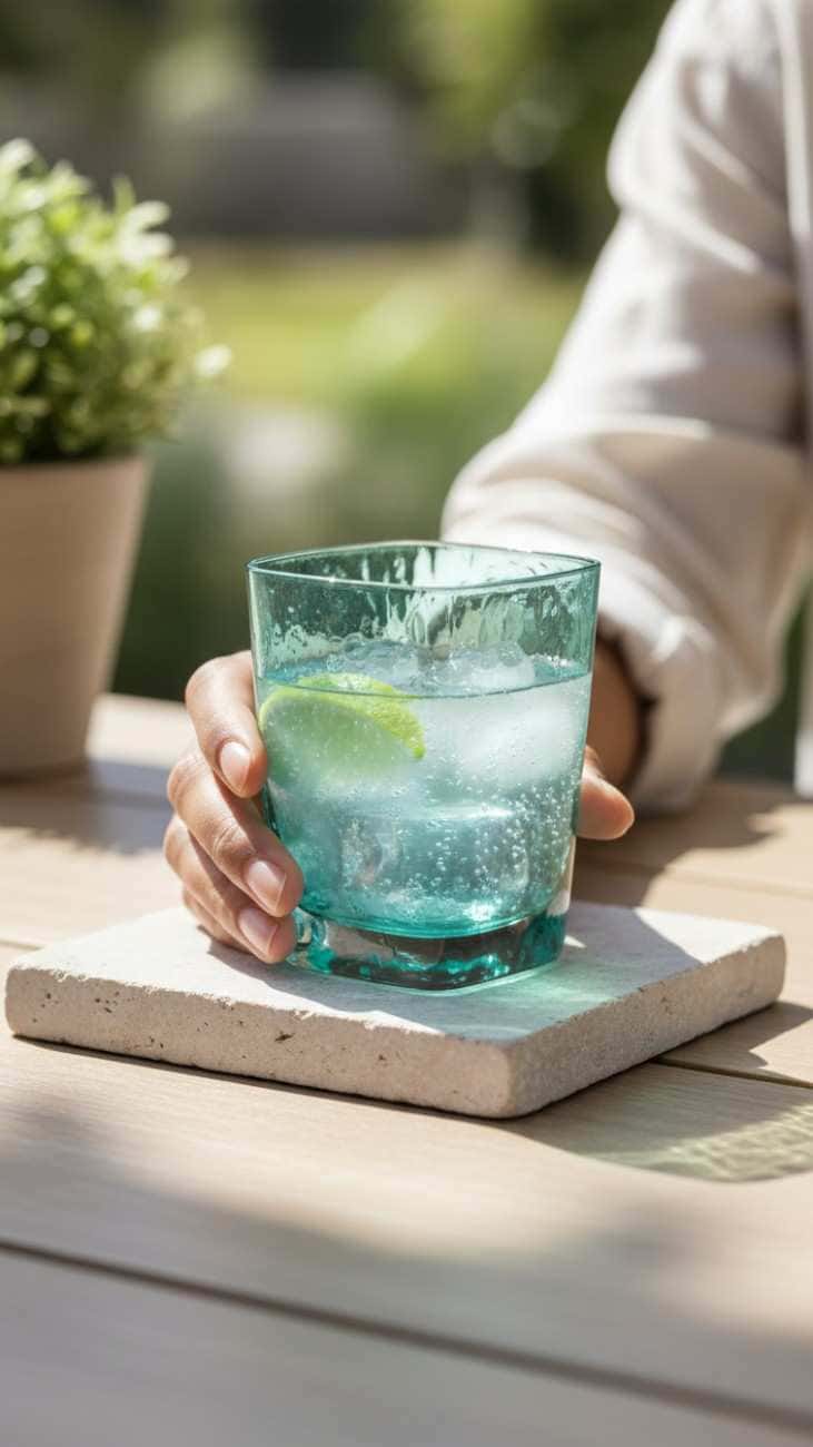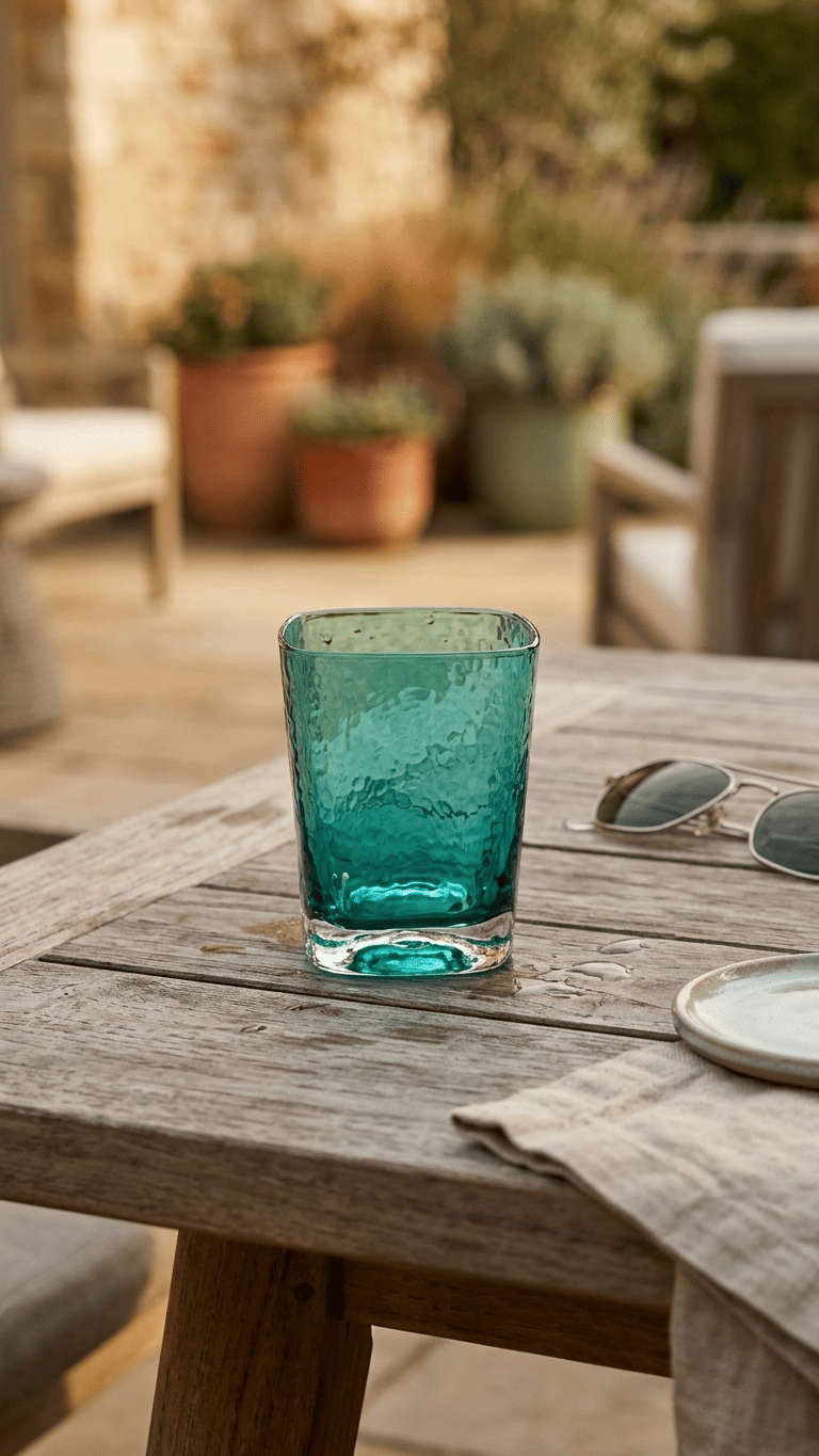 This stunning turquoise glass tumbler features a beautiful ombre gradient that transitions from deep teal at the base to light aqua at the rim. The embossed textured surface adds visual interest and provides a comfortable grip. Perfect for serving cold beverages, cocktails, or everyday use, this modern drinkware piece combines style with functionality.
