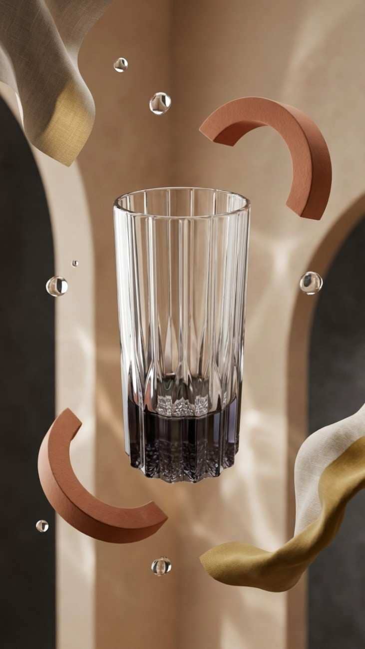 This sophisticated crystal glass tumbler features a striking vertical ridge pattern that adds elegance to any drinkware collection. The smoke grey gradient at the base creates a modern aesthetic, while the clear crystal construction showcases your beverages beautifully. Perfect for serving water, juice, cocktails, or any cold beverage in style.